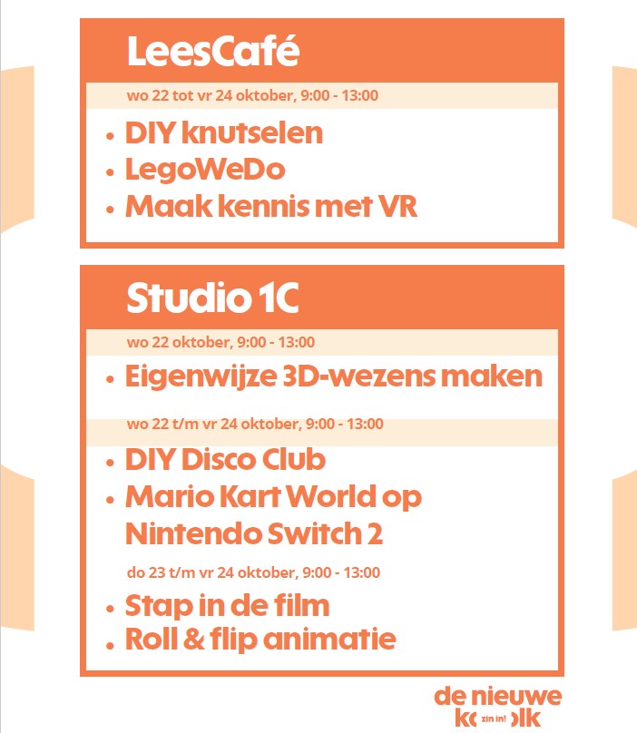 Kom deze herfstvakantie naar de 39ste editie van Cinekid Festival in De Nieuwe Kolk! Van 22 tot en met 24 oktober kijk je hier de mooiste films en ga je voordat de film begint los in het Cinekid MediaLab bij de ingang van de bieb en in Studio 1C. Ontdek een digitale speeltuin met workshops, games, DIY Knutsel-kits en nog veel meer!